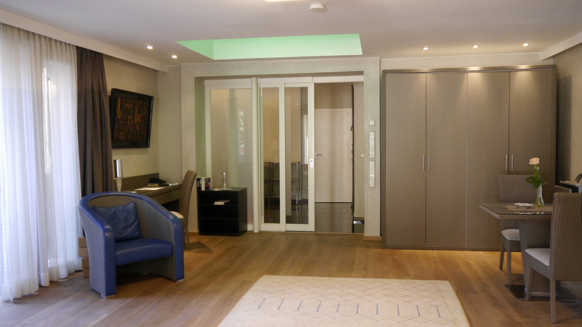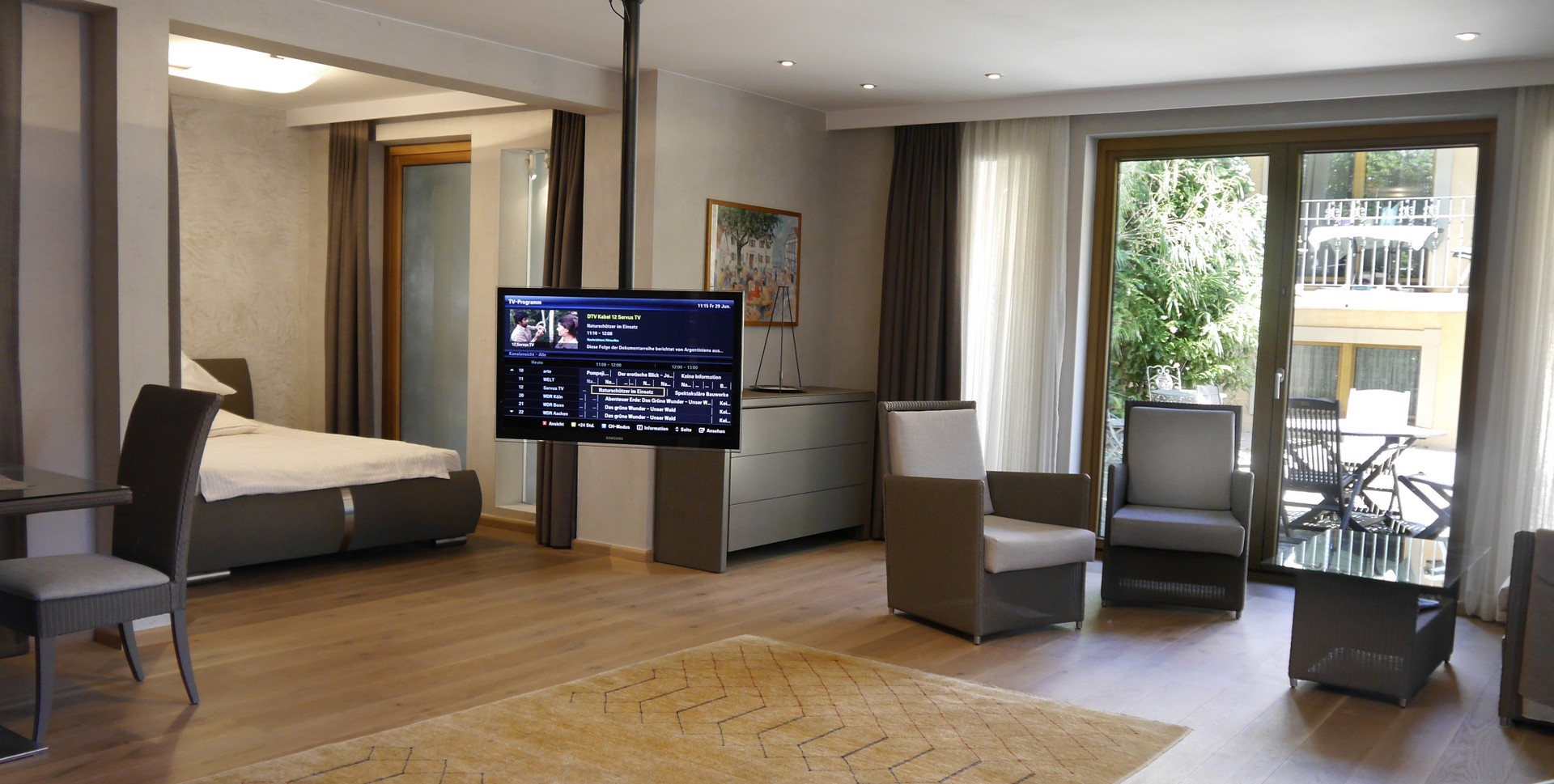 Diese Suite beeindruckt durch schöne hölzerne Parkett-Dielen. Kombiniert mit modernen Elementen und hat diese Einheit Ihren ganz eigenen Charme. Der Kitchenettebereich (Vollaustattung) ist separiert durch eine Glasschiebetüre zum Wohn-Schlafraum. Diese Einheit ist geeignet bis 2 Personen und verfügt über eine wunderschöne großzügige umlaufende Terrasse. Das hochwertige Granitbadezimmer ist mit Dusche ausgestattet.
